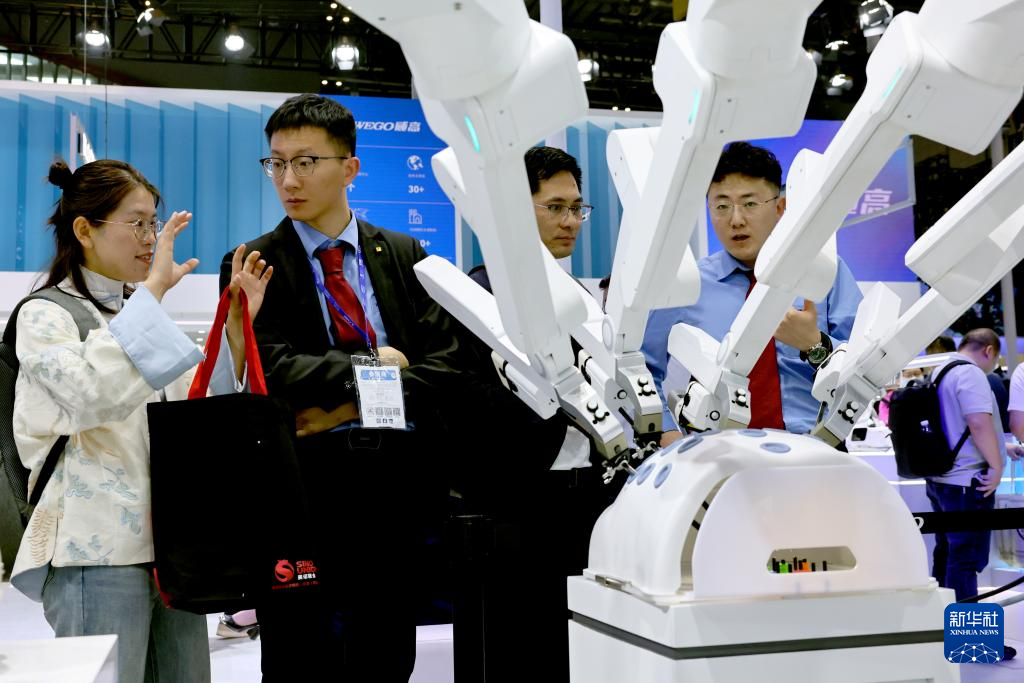8日、手術用ロボットの傍らで交流する来場者。(上海=新華社記者/方喆)