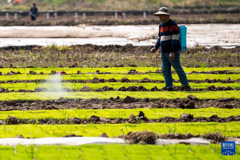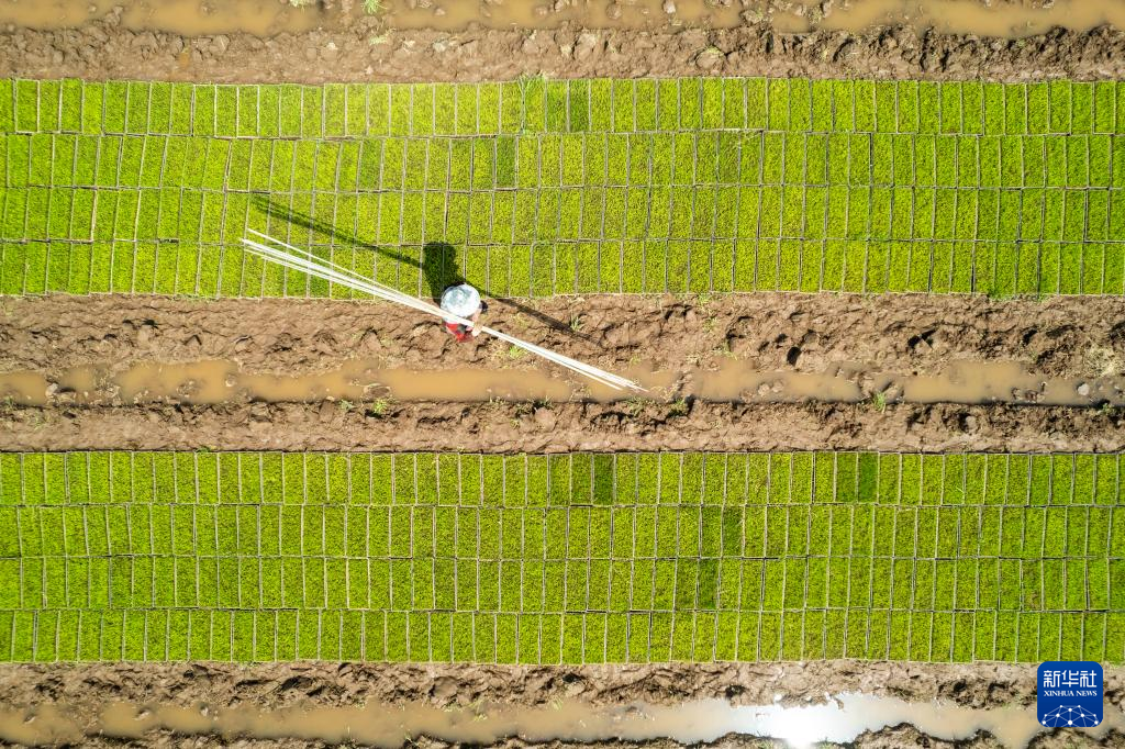 2日、南県浪抜湖鎮集中育苗センターの苗代で作業する農家の人。(益陽=新華社記者/陳思汗)