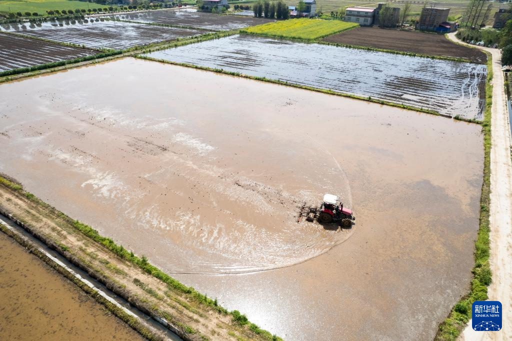 2日、南県浪抜湖鎮集中育苗センターで、農業機械を使って苗代の整地作業を行う農家。(ドローンから、益陽=新華社記者/陳思汗)pagebreak
