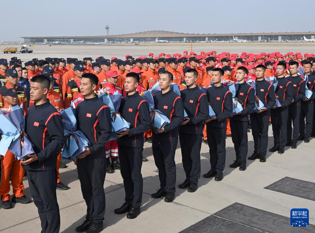 9日、北京に到着した中国救援隊の隊員。 (北京=新華社記者/才揚)