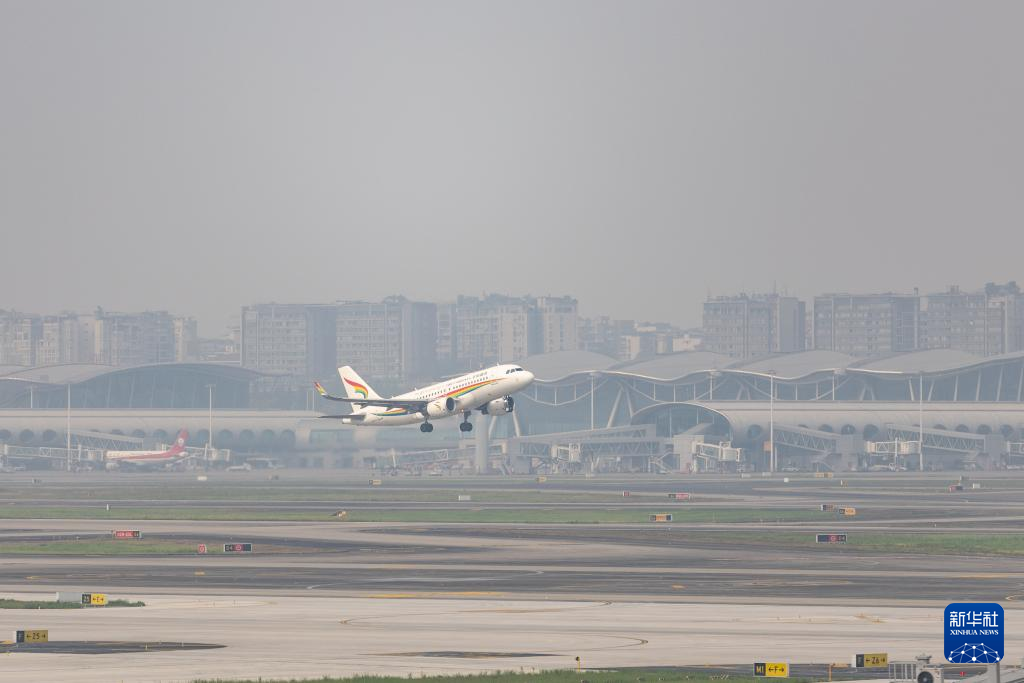 9日、重慶江北国際空港を離陸した航空機。(重慶=新華社記者/黄偉)