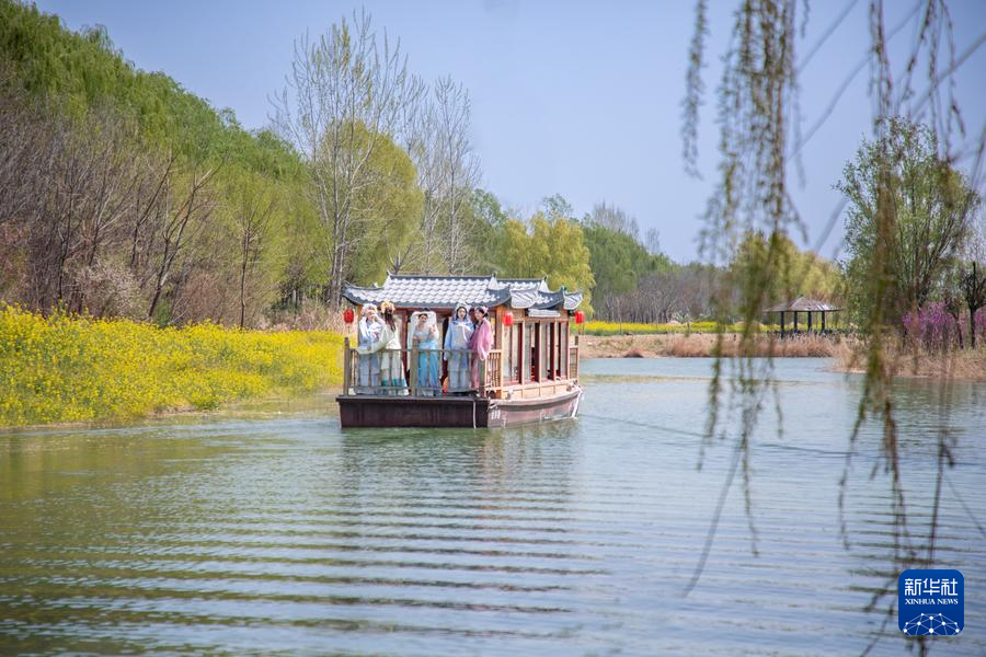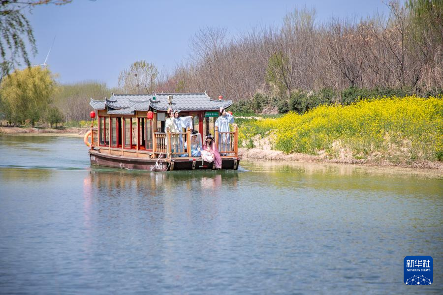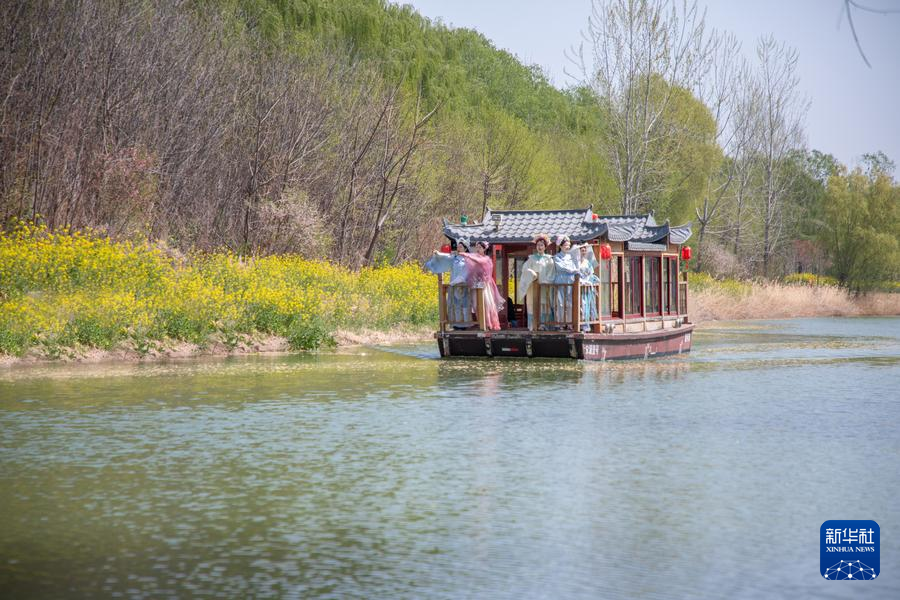 1日、封丘県で舟に乗って菜の花を楽しむ漢服姿の女性たち。(封丘=新華社配信/段騫)