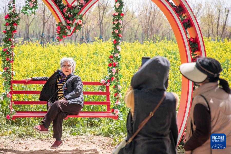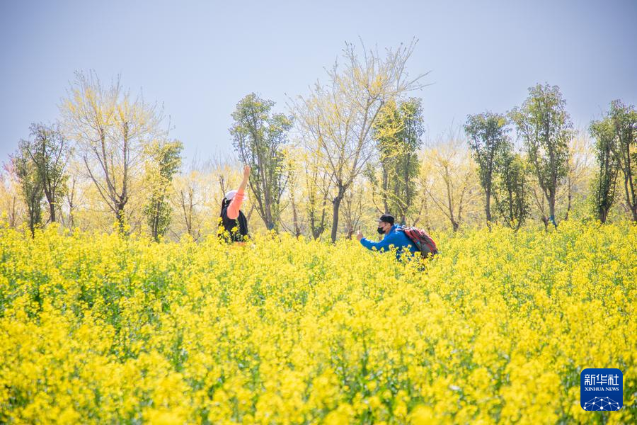 1日、封丘県の黄河沿いに広がる菜の花畑で撮影を楽しむ観光客。(封丘=新華社配信/段騫)