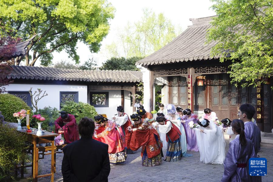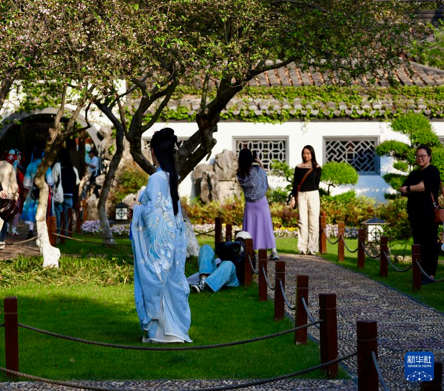 5日、伝統衣装をまとい、莫愁湖公園の花祭り会場で活動するスタッフ。(南京=新華社記者/趙久竜)