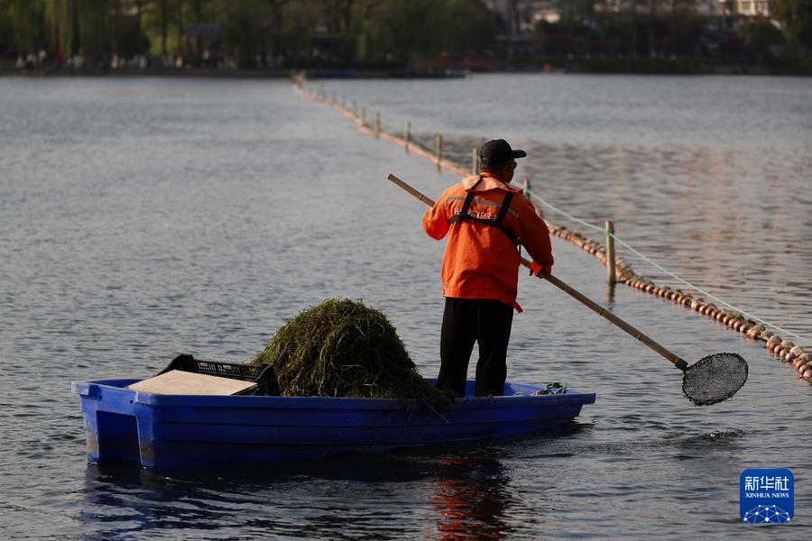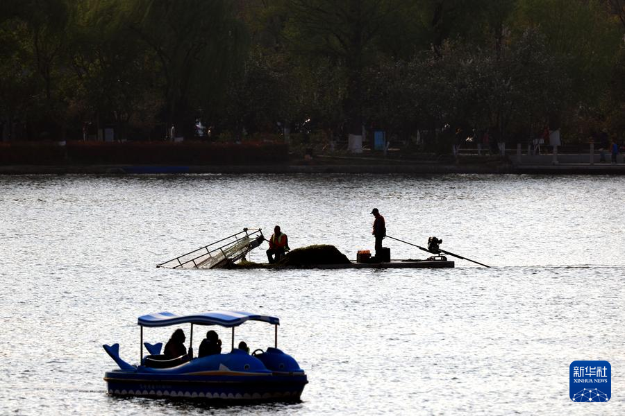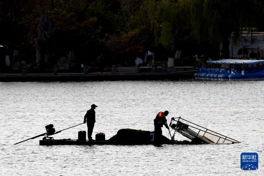 2日、莫愁湖公園の湖で除草作業をするスタッフ。(南京=新華社記者/趙久竜)