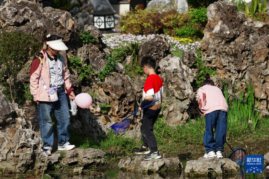 5日、莫愁湖公園の湖畔で遊ぶ子どもたち。(南京=新華社記者/趙久竜)