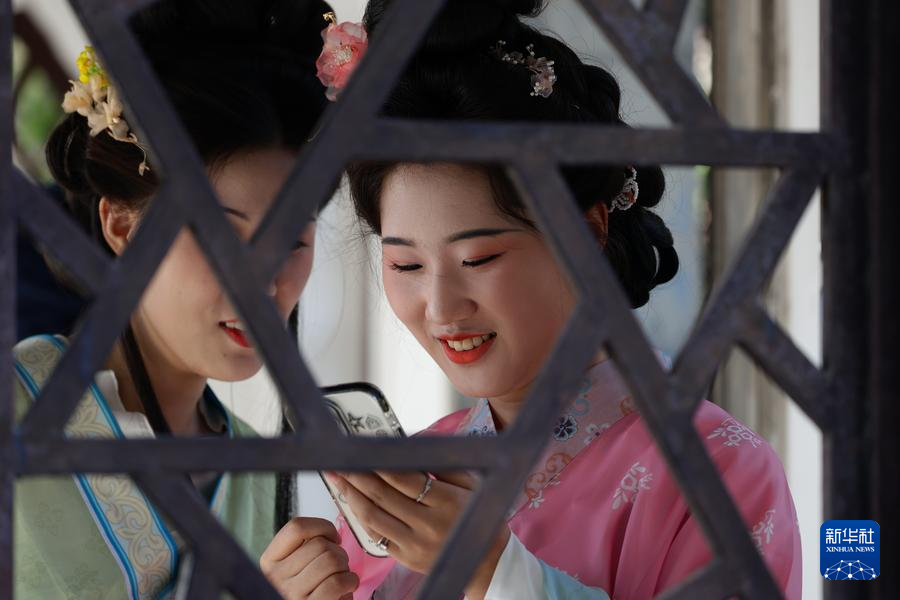 5日、伝統衣装をまとい、莫愁湖公園で撮影を楽しむ観光客。(南京=新華社記者/趙久竜)