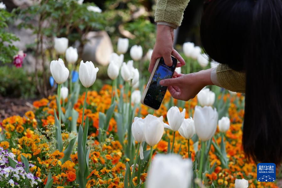 5日、莫愁湖公園で花を撮影する観光客。(南京=新華社記者/趙久竜)