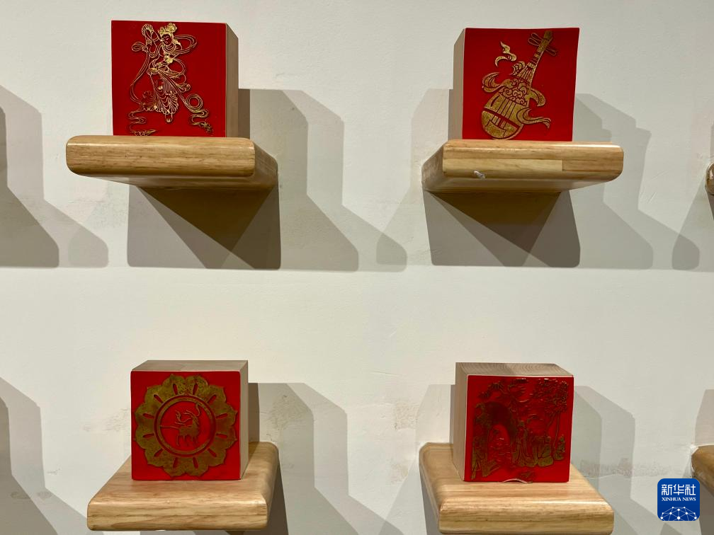 敦煌の飛天や楽器を題材にした印章。(3月24日撮影、敦煌=新華社記者/張玉潔)