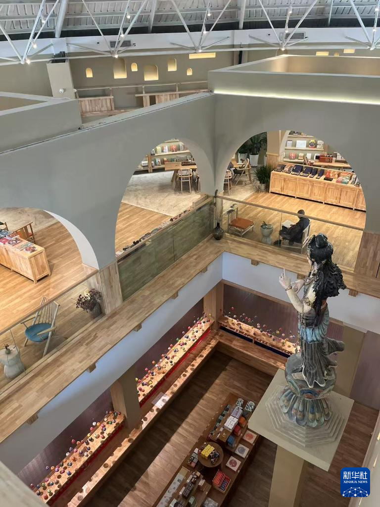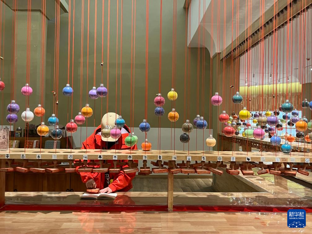 敦煌印局に足を踏み入れると、コーヒーの香りと芸術的な雰囲気に包まれる。数百個の色鮮やかな砂時計に風景や天井装飾、建築、舞のしぐさなど敦煌文化にまつわる図案の印章が結び付けられ、観光客が印を押すたびに心地良い音を立てる。