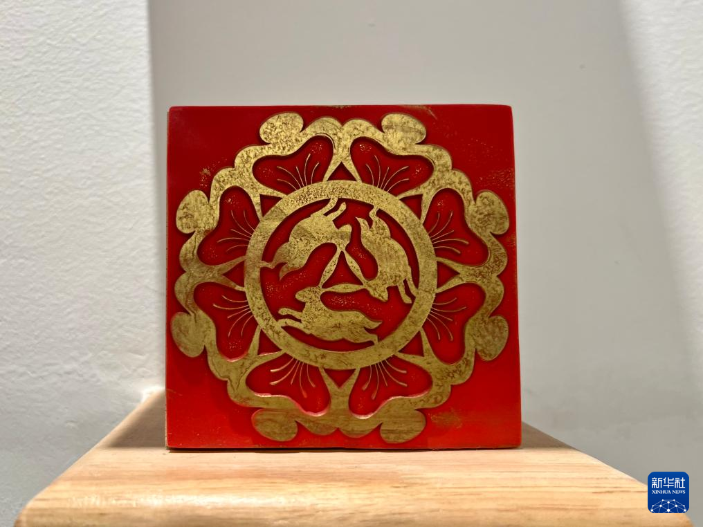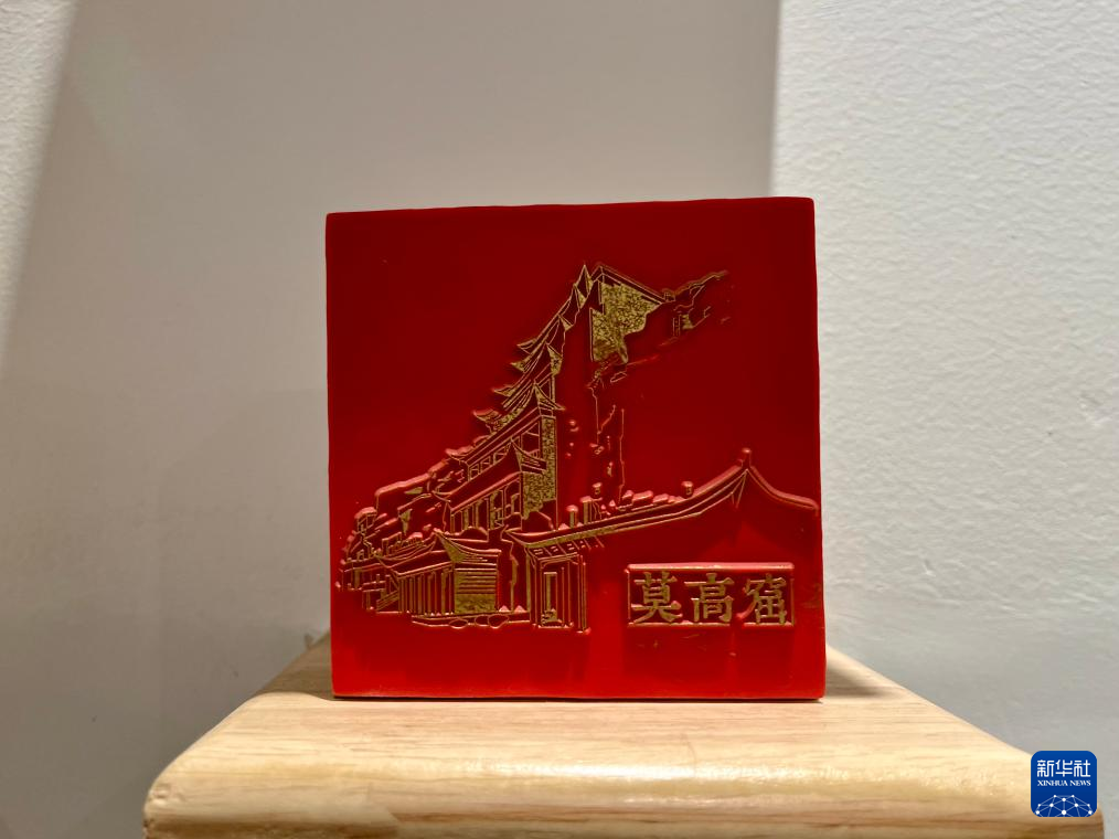 敦煌莫高窟(ばっこうくつ)の九層楼を題材にした印章。(3月24日撮影、敦煌=新華社記者/張玉潔)