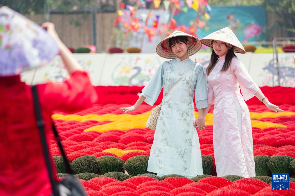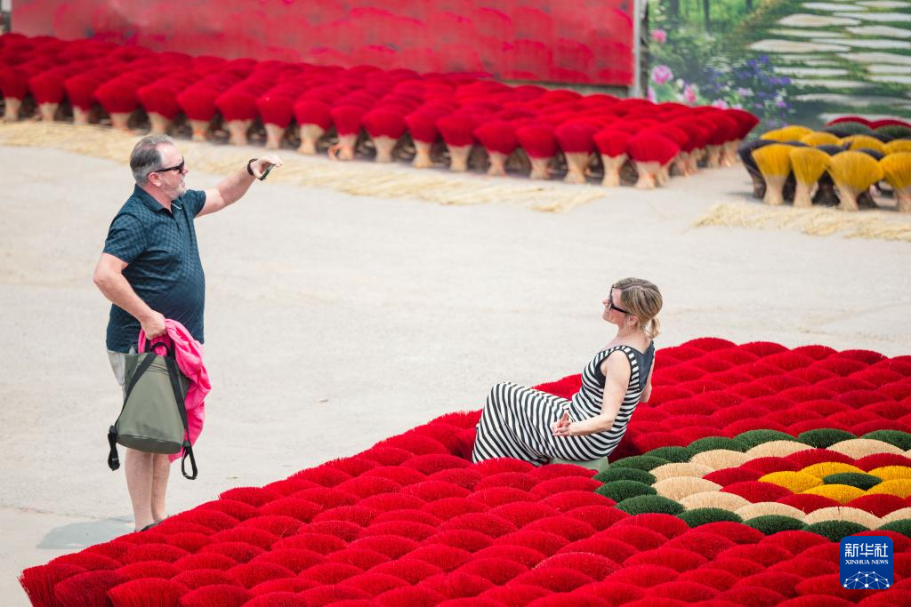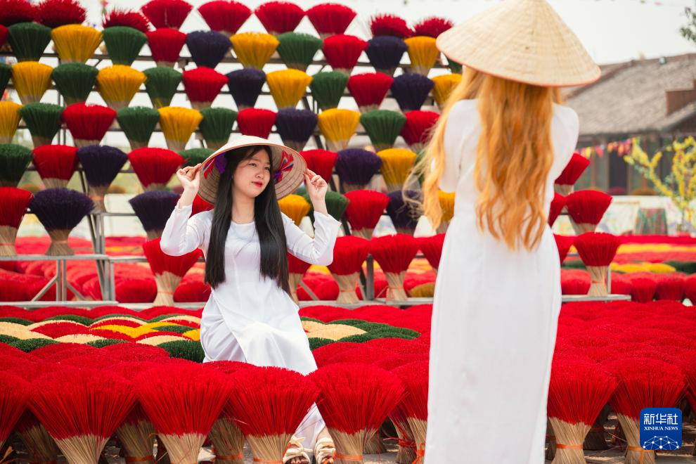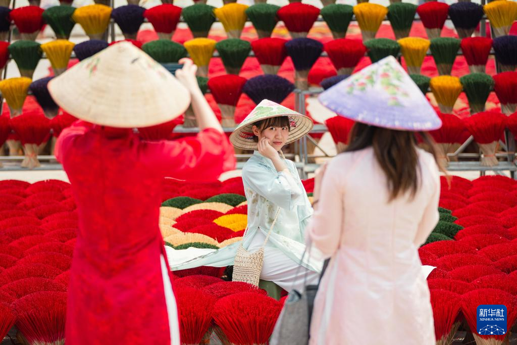 ベトナムのクアン・フー・カウ村で天日干しされた線香の芯材を背景に撮影する観光客。(3月24日撮影、ハノイ=新華社記者/朱煒)