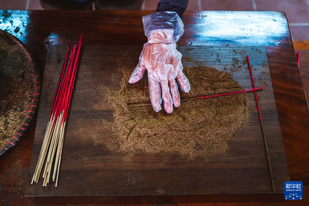 ベトナムのクアン・フー・カウ村で、線香作りを実演する農家の人。(3月24日撮影、ハノイ=新華社記者/朱煒)pagebreak