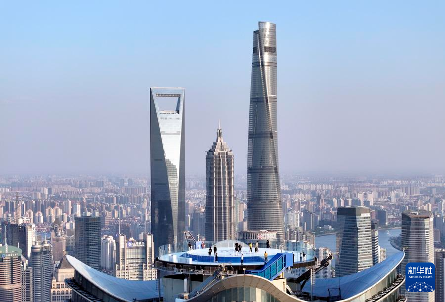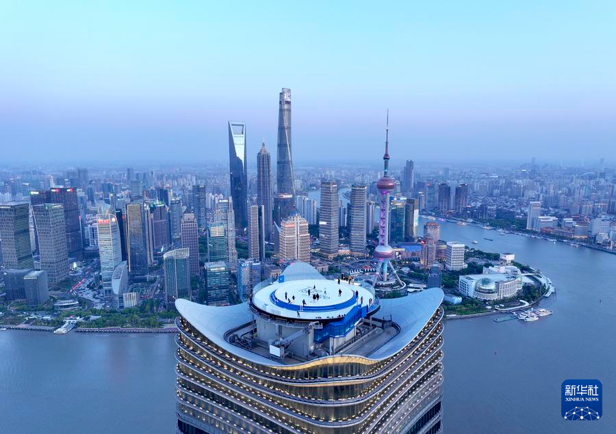 14日、上海白玉蘭広場の展望台「The Stage」。(ドローンから、上海=新華社記者/劉穎)