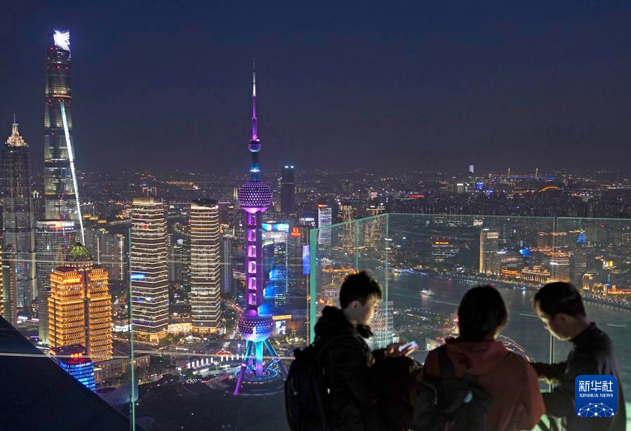 14日、上海白玉蘭広場の展望台「The Stage」で上海の夜景を楽しむ人々。(上海=新華社記者/劉穎)