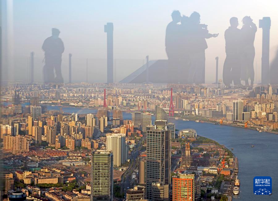14日、上海白玉蘭広場の展望台「The Stage」のガラスに映る人々の影。(上海=新華社記者/劉穎)