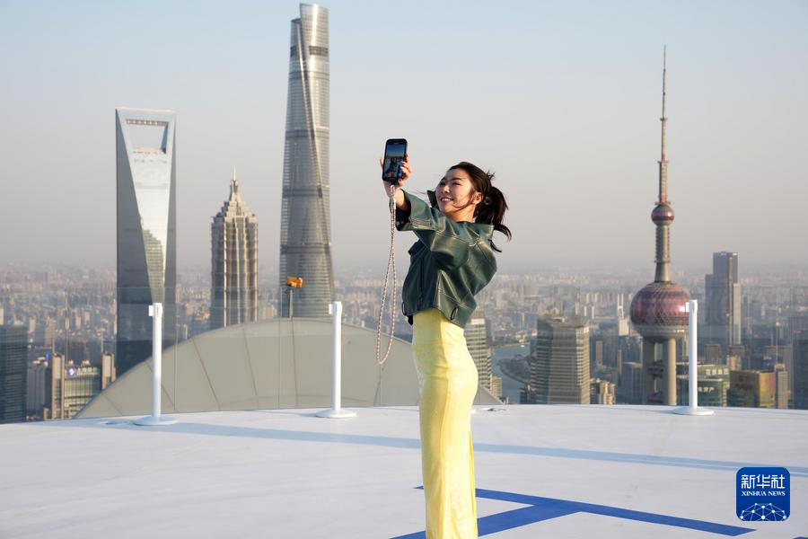 14日、上海白玉蘭広場の展望台「The Stage」で自撮りする女性。(上海=新華社記者/劉穎)