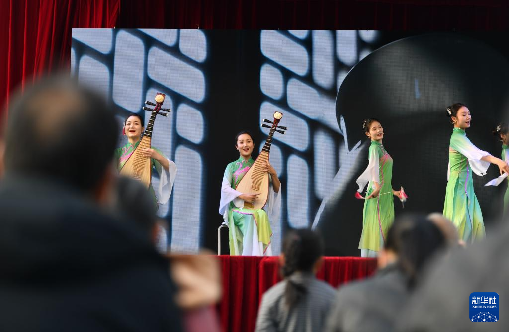 公共の無料ステージで芸能を披露する常徳絲弦の若手伝承者、伍恩禹さん(左から2人目)。(3月18日撮影、常徳=新華社記者/趙仲志)