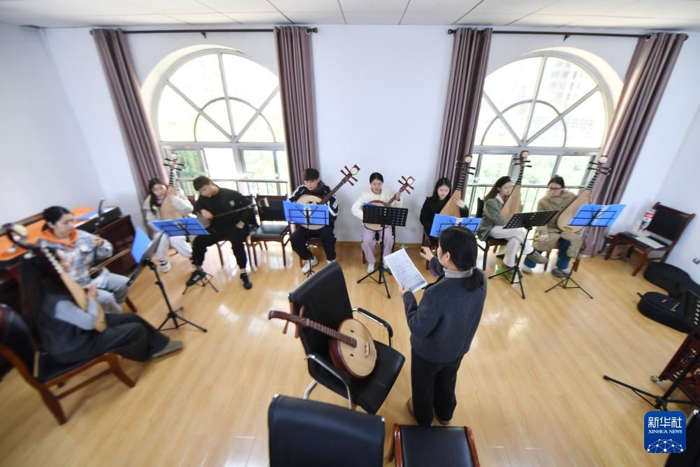 絹弦楽器の練習をする常徳絲弦芸術劇院の若手演者たち。(3月18日撮影、常徳=新華社記者/趙仲志)