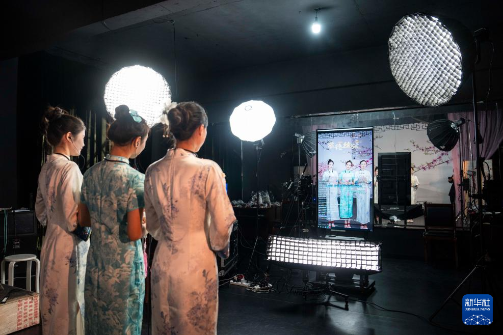 常徳絲弦を紹介し、ライブ配信をする常徳絲弦芸術劇院の若手演者の謝顔竹さん(左から2人目)と共演者たち。(3月17日撮影、常徳=新華社記者/陳思汗)