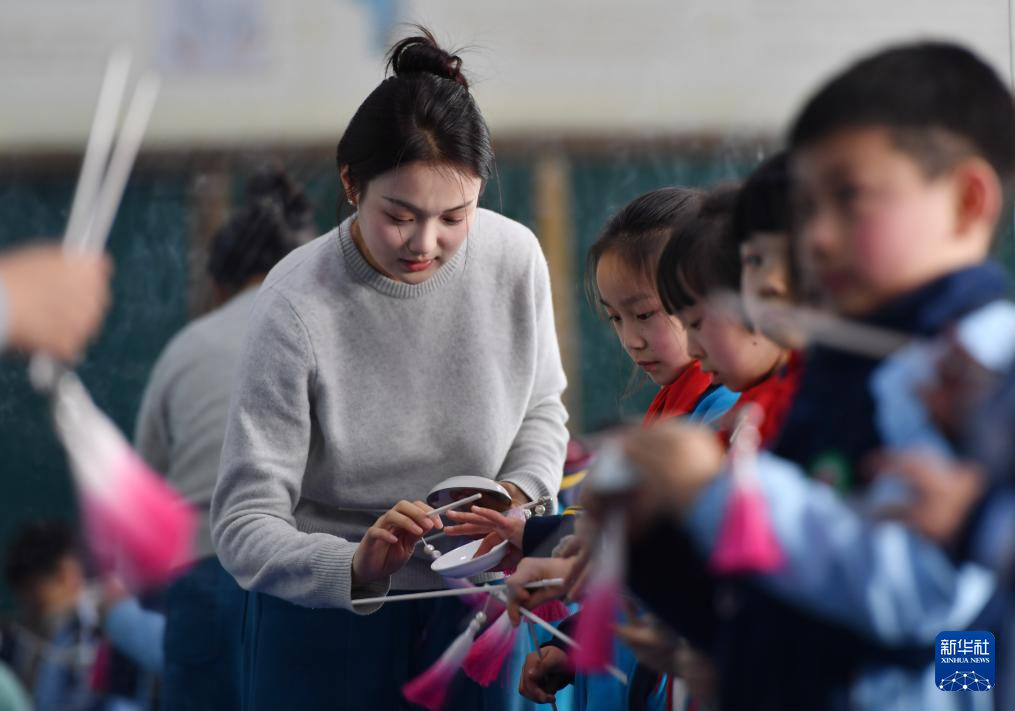 常德市鼎城区花船廟小学校で子どもたちに常徳絲弦を教える常徳絲弦芸術劇院の若手演者の謝顔竹さん。(3月18日撮影、常徳=新華社記者/趙仲志)