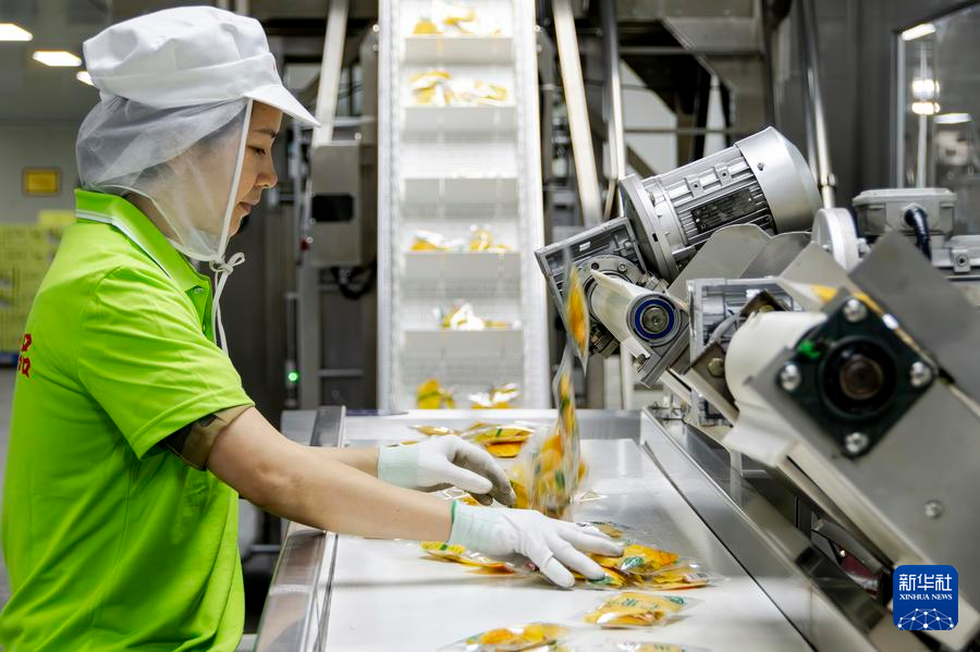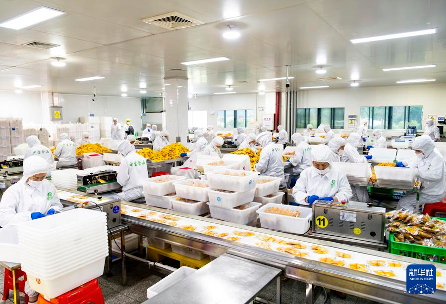 福建省漳州市平和県にある中宝(福建)食品科技の食品加工生産ラインで、カンボジア産のドライマンゴーを選別する従業員。(3月26日撮影、漳州=新華社記者/魏培全)