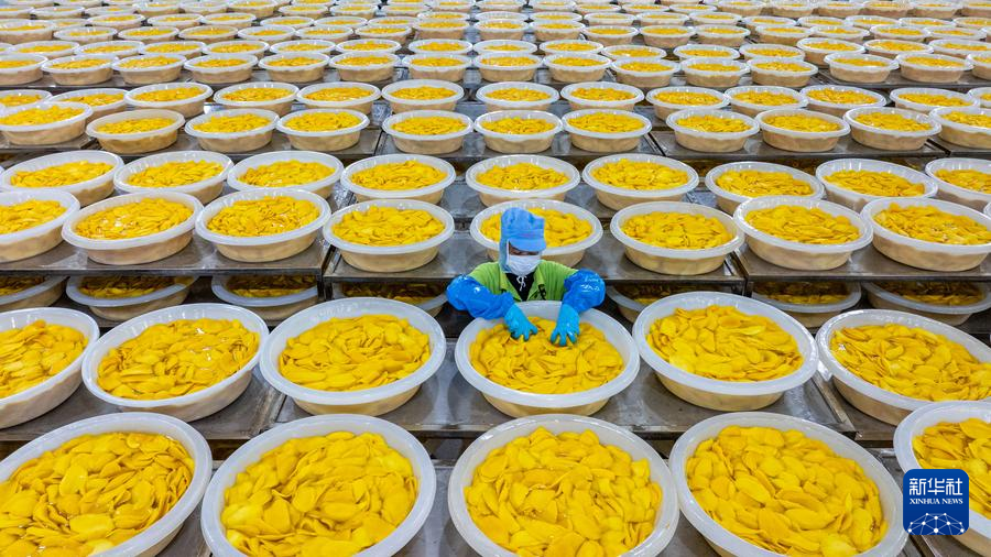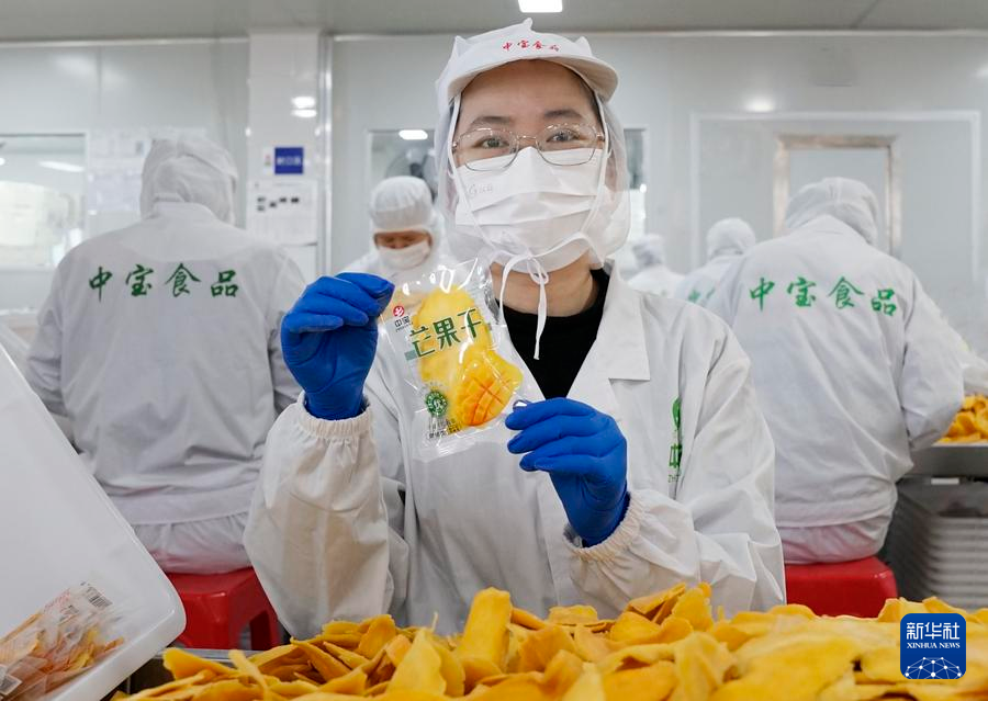 福建省漳州市平和県にある中宝(福建)食品科技の食品加工生産ラインで、カンボジア産マンゴーを使ったドライマンゴーを見せる従業員。(3月26日撮影、漳州=新華社記者/魏培全)
