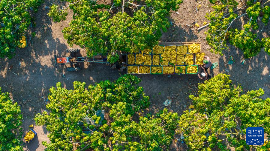 カンボジア・コンポンスプー州プノンスルオチ郡のマンゴー園で、マンゴーを運ぶ従業員。(3月18日、ドローンから、プノンスルオチ=新華社配信/張金加) pagebreak