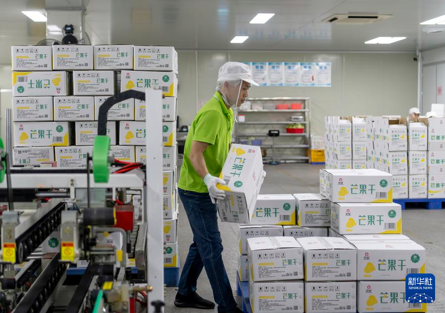 福建省漳州市平和県にある中宝(福建)食品科技の食品加工生産ラインで、ドライマンゴーを詰めた箱を運ぶ従業員。(3月26日撮影、漳州=新華社記者/魏培全)