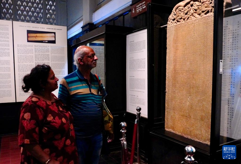 17日、スリランカ・コロンボの国立博物館で展示されている、鄭和に関わる遺跡「布施セイロン山仏寺碑」を見学する来場者。(コロンボ=新華社記者/伍岳)