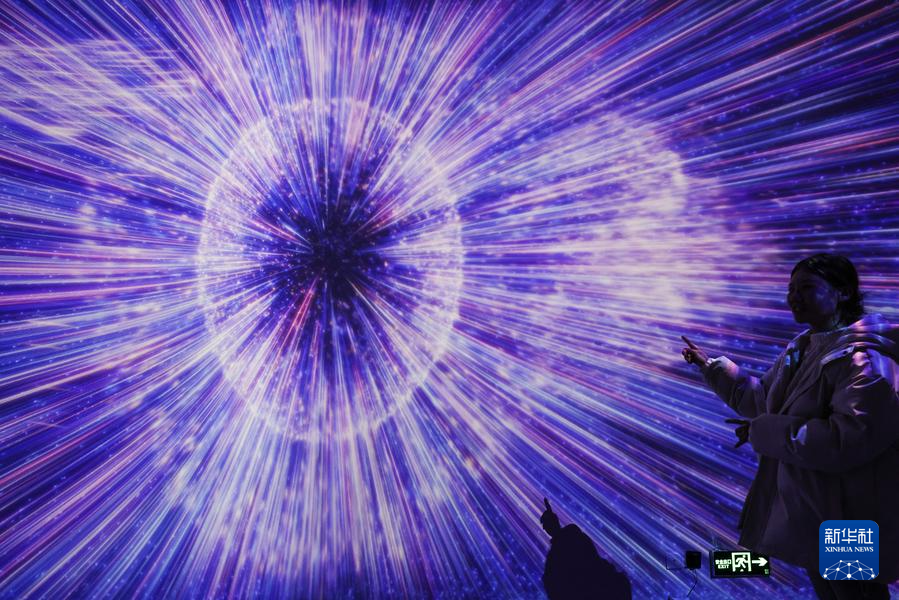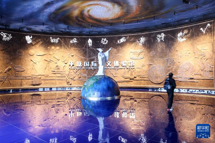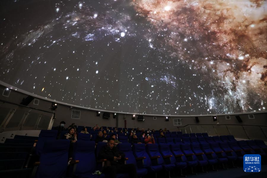 平塘県の「天文小鎮」にある天文体験館で、ドーム型スクリーンに映し出された映像を鑑賞する観光客。(2月18日撮影、貴陽=新華社記者/欧東衢)