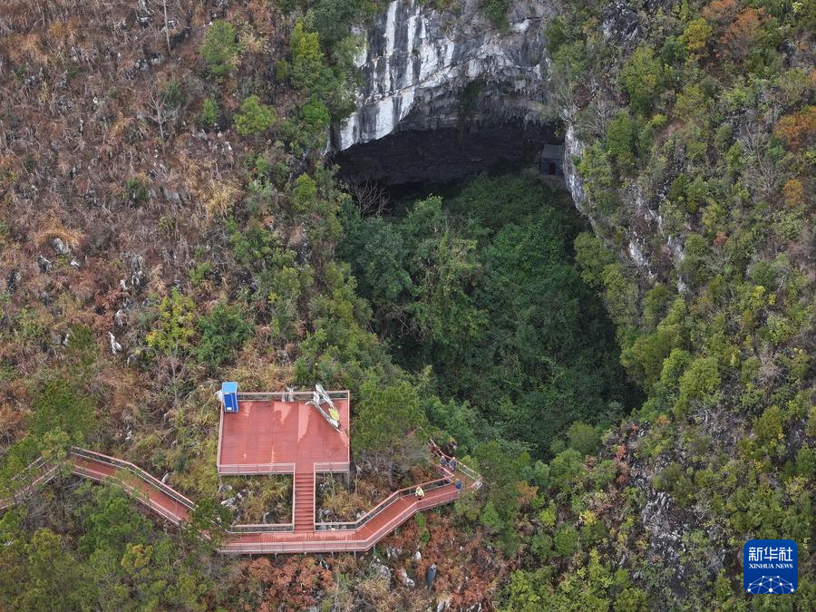 平塘県にある洞窟「平塘天硐」を訪れた観光客。(2月19日、ドローンから、貴陽=新華社記者/劉続)pagebreak