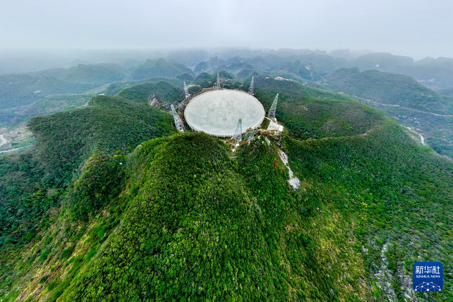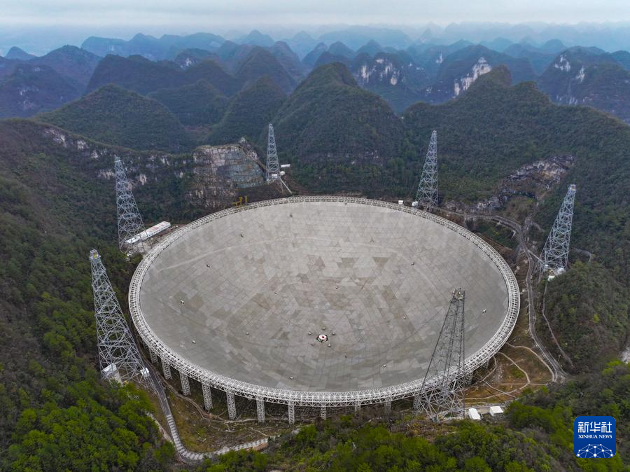 平塘県にある電波望遠鏡「中国天眼」。(2月18日、ドローンから、貴陽=新華社記者/欧東衢)