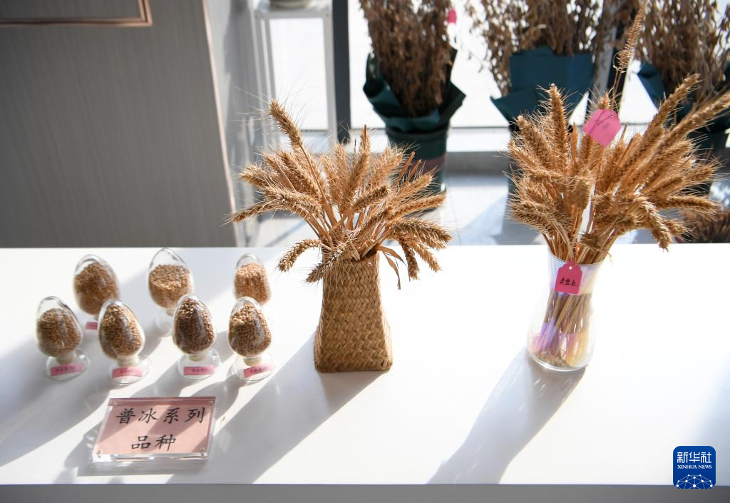 中国農業科学院中原研究センターで展示された小麦の新品種「普氷」シリーズの種子と穂。(2024年12月25日撮影、鄭州=新華社記者/郝源)