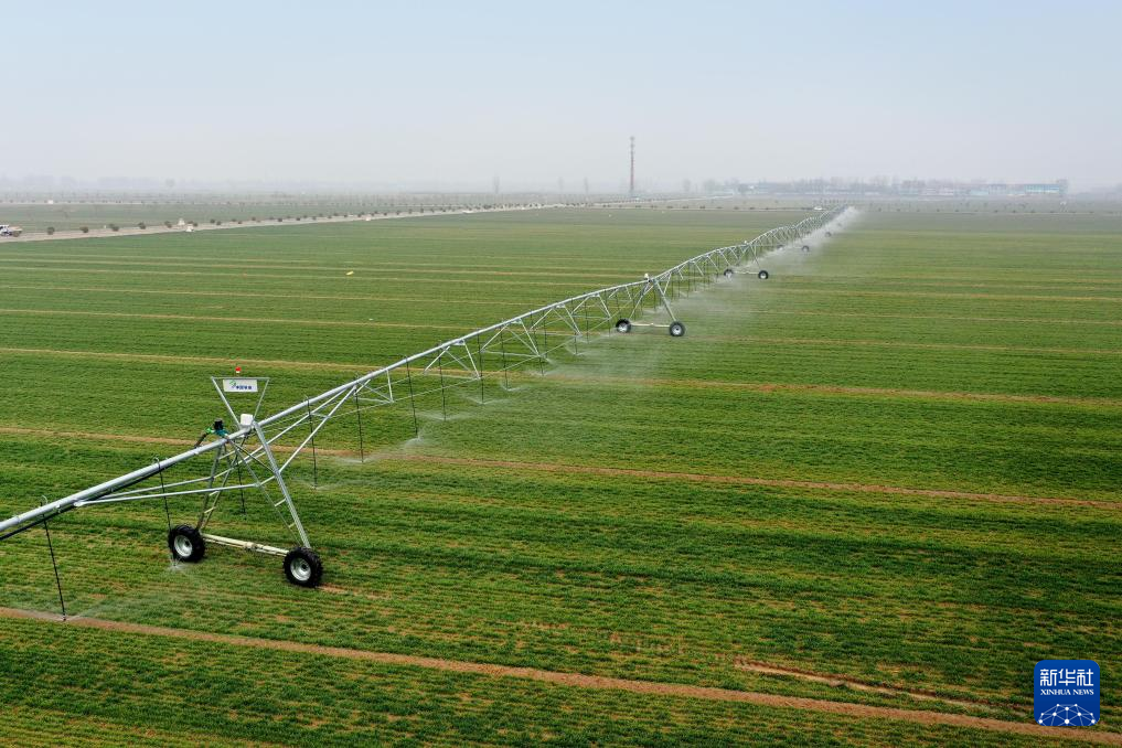河南省新郷市平原モデル区の高規格農地で、散水する移動式スプリンクラー。(3月4日、ドローンから、鄭州=新華社配信/趙雲)