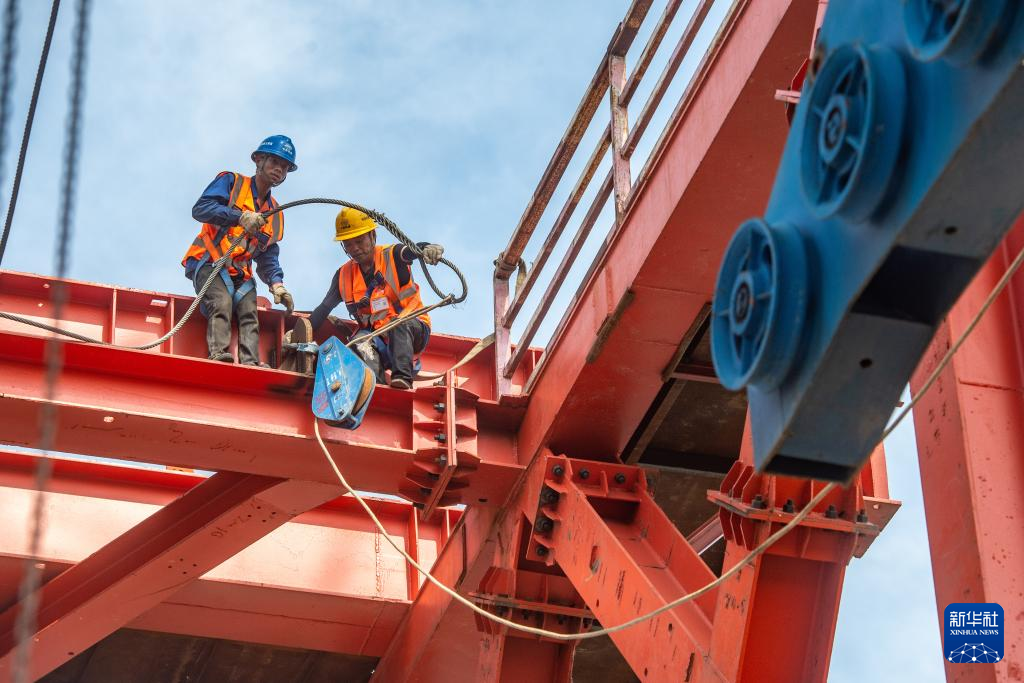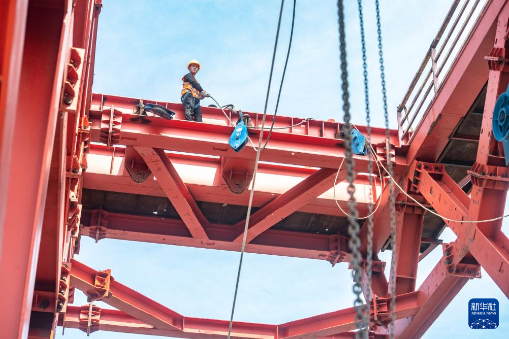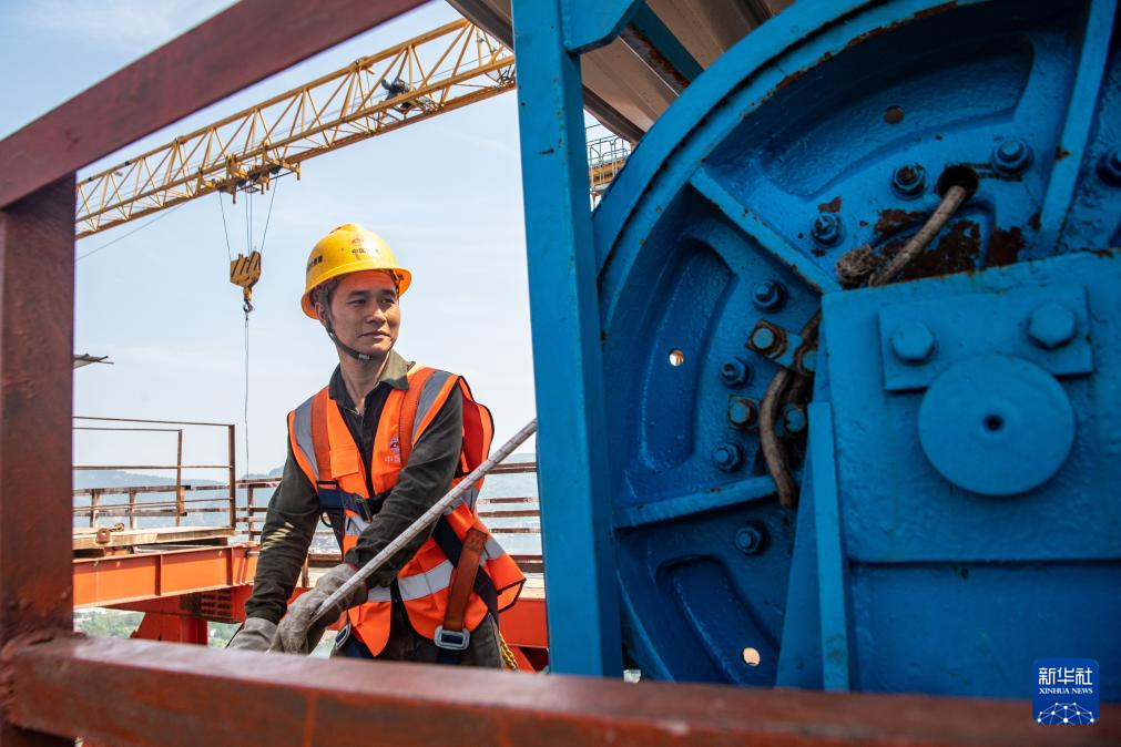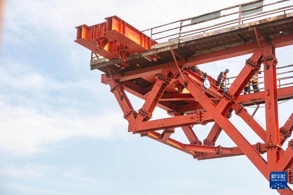 19日、黄桷沱長江大橋の建設現場でパイロットロープを架設する作業員。(重慶=新華社記者/唐奕)