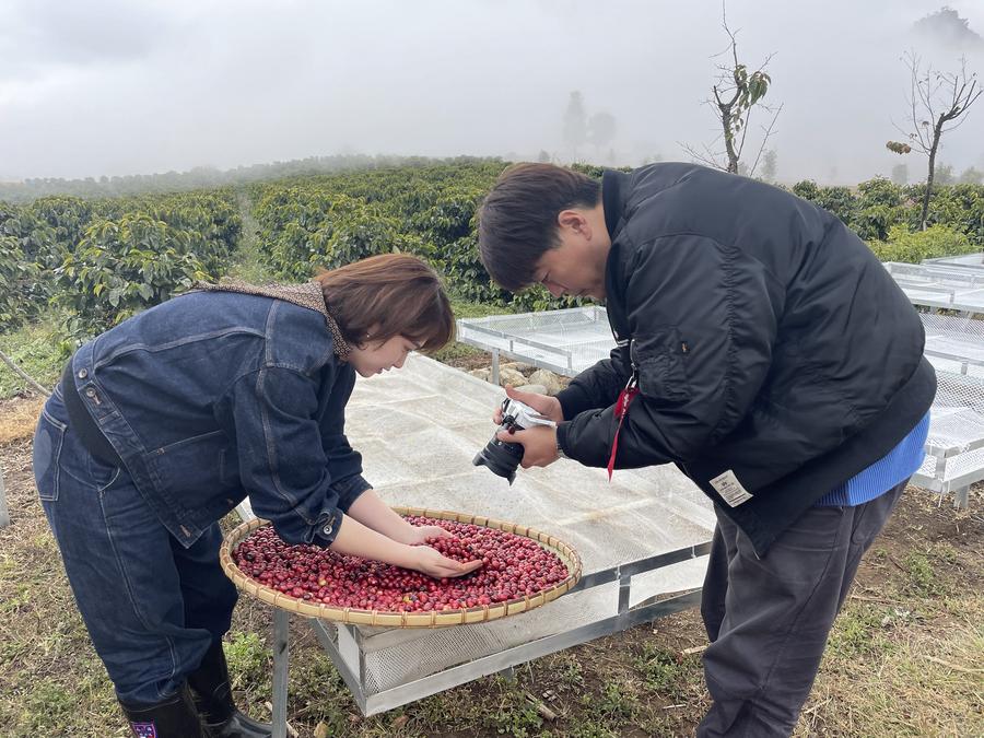 雲南のコーヒー畑で収穫したコーヒーチェリーを撮影する金泰浩さんと王煒婷さん(左)。(2024年1月撮影、昆明=新華社配信)