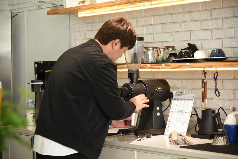 山達コーヒー工場でコーヒーを入れる金泰浩さん。(3月26日撮影、昆明=新華社記者/王賢思)