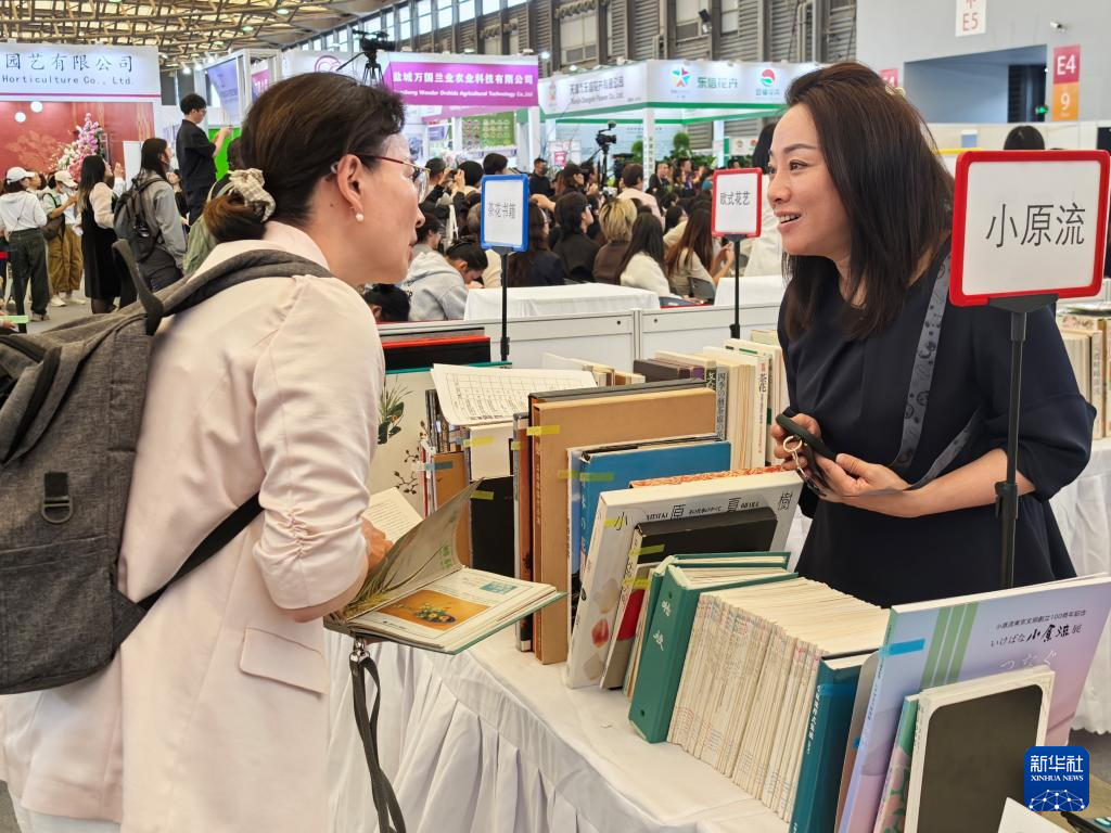 中国国際花卉園芸展覧会で日本の生け花に関する本の売り場を訪れた来場者。(4月10日撮影、上海=新華社記者/呉宇)