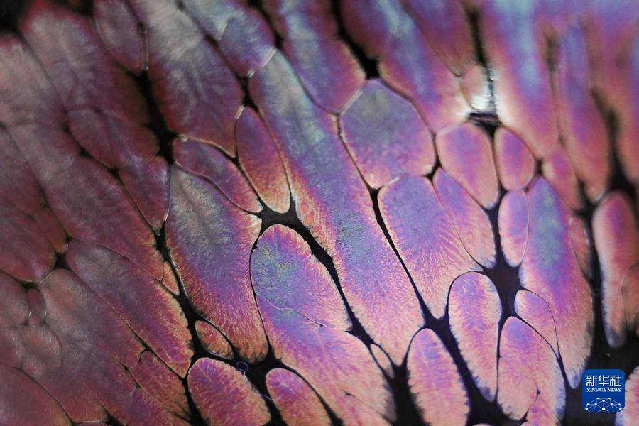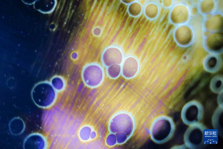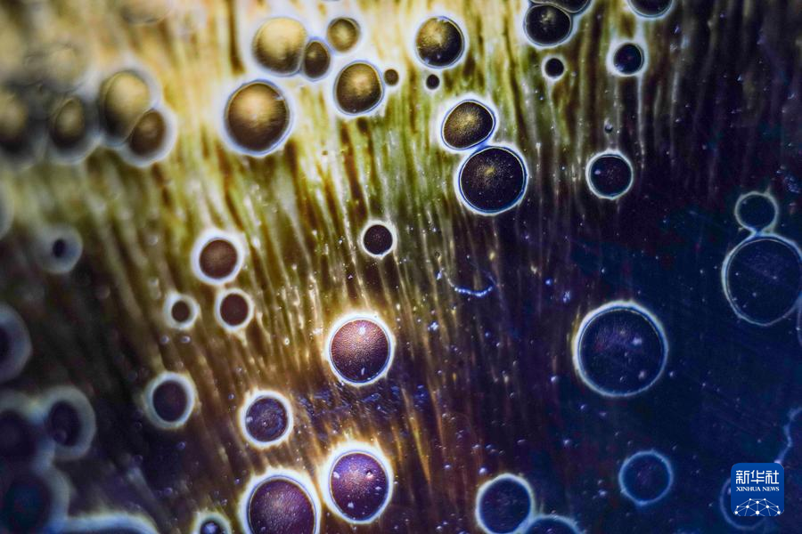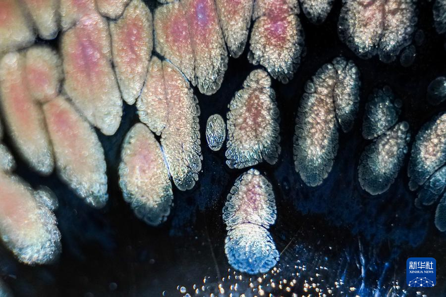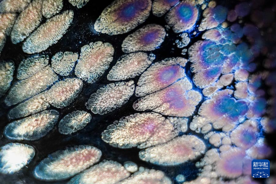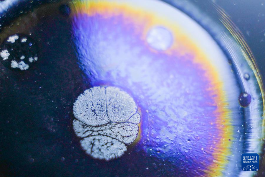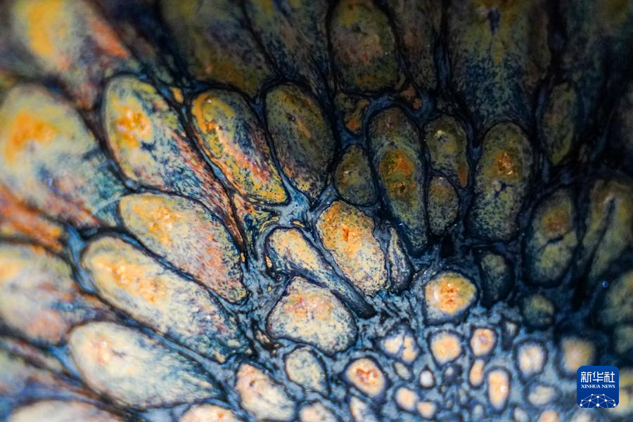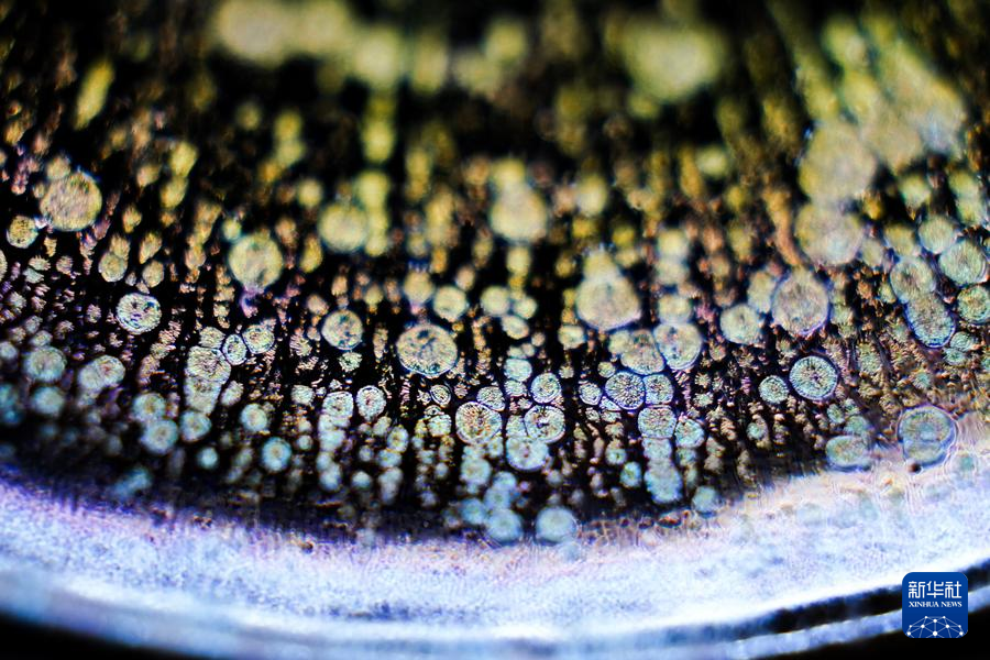 【新華社福州4月25日】中国福建省に伝わる天目茶わん「建盞(けんさん)」は宋代八大名磁器の一つで、黒釉磁器の手本とされる。独創的な工夫を凝らした焼成技法、粘土と火が起こす物理化学的反応が、この類いまれな宝を生み出す。マクロレンズを通して見る建盞は、幻想的な模様が鮮やかに浮かび、息をのむほど美しい。