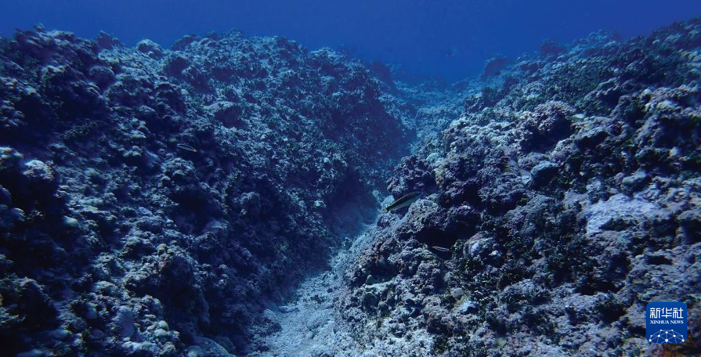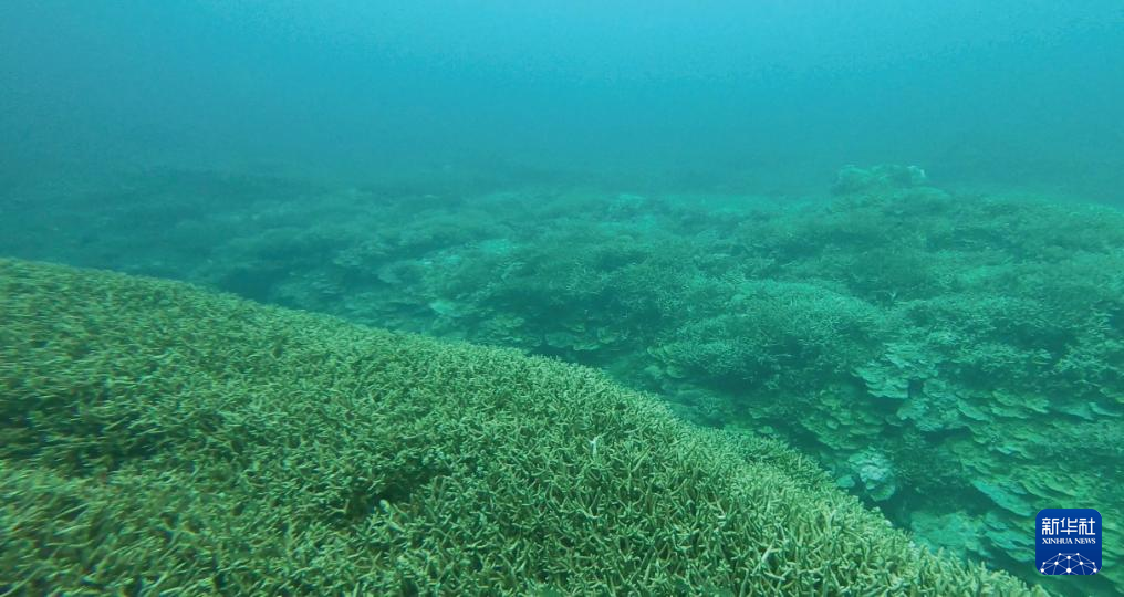 「鉄線礁・牛軛礁のサンゴ礁生態系調査報告書」に掲載された鉄線礁のサンゴの成長状況を示す写真。(北京=新華社配信)