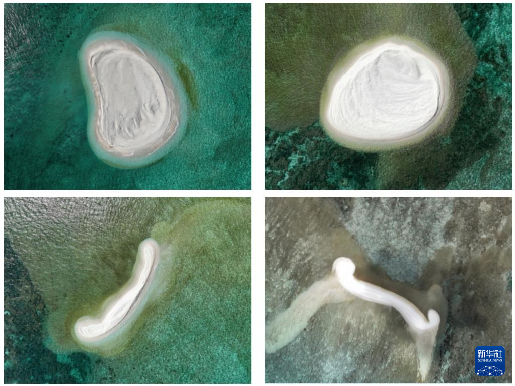 満潮時に鉄線礁、牛軛礁の海面上に露出した砂州。左上:鉄線礁1号砂州。右上:鉄線礁2号砂州。左下:鉄線礁3号砂州。右下:牛軛礁1号砂州。(組み合わせ写真、北京=新華社配信)