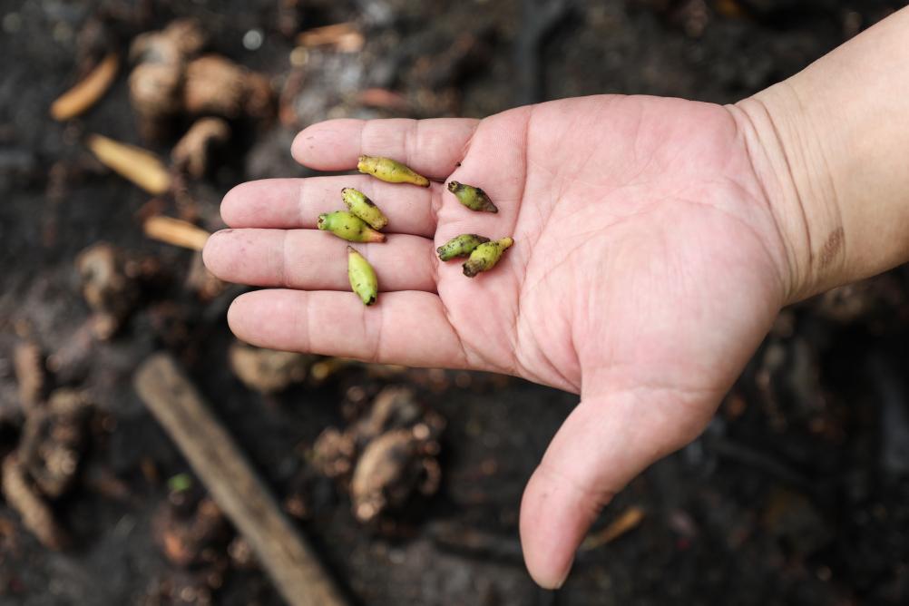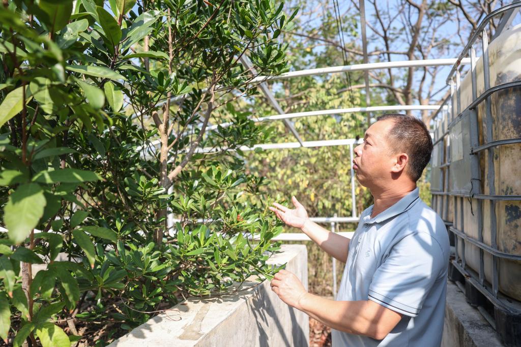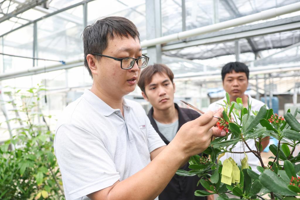 温室ハウスでアカバナヒルギモドキの授粉実験を行う技術者。(4月10日撮影、海口=新華社記者/張麗蕓)