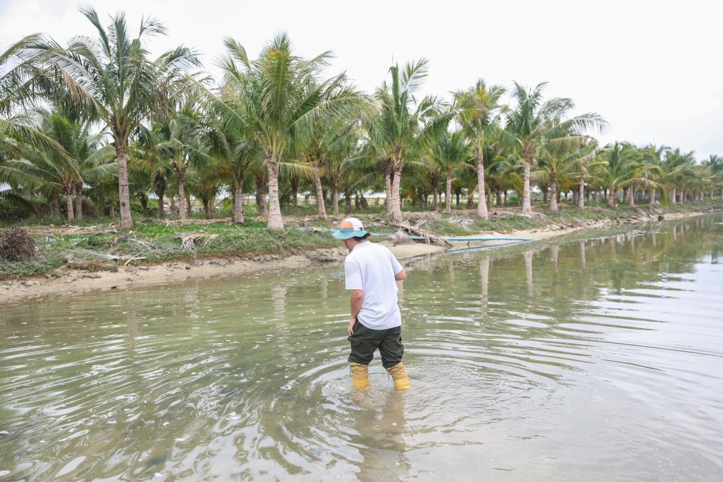 三亜鉄炉港マングローブ自然保護区で川を渡る三亜市林業科学研究院の技術者。(4月10日撮影、海口=新華社記者/張麗蕓)