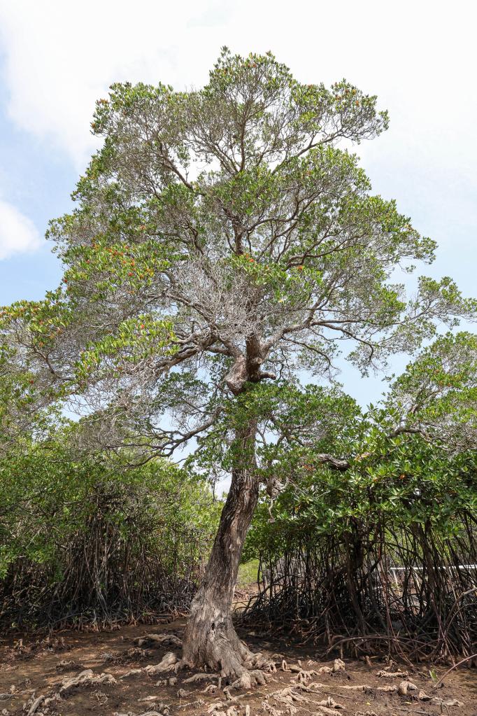 三亜鉄炉港マングローブ自然保護区で、花を咲かせる樹齢100年のアカバナヒルギモドキ。(4月9日撮影、海口=新華社記者/張麗蕓)
