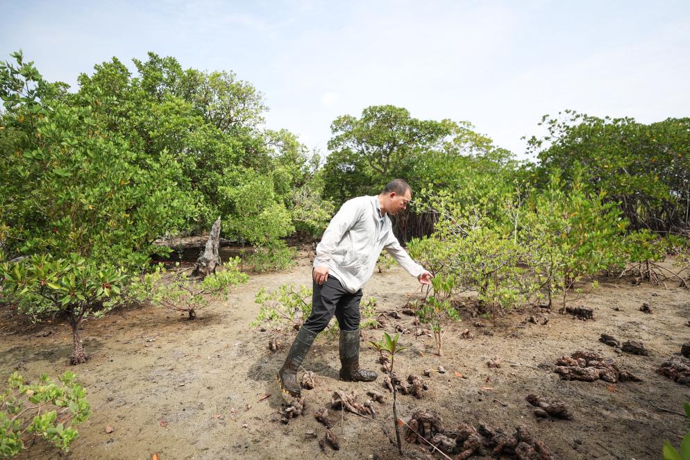 アカバナヒルギモドキの生育を確認する技術者。(4月9日撮影、海口=新華社記者/張麗蕓)