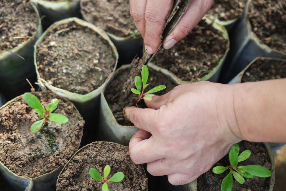 温室ハウスでアカバナヒルギモドキの幼苗を移植する技術者。(4月9日撮影、海口=新華社記者/張麗蕓)