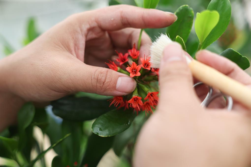 温室ハウスでアカバナヒルギモドキの人工授粉実験を行う技術者。(4月10日撮影、海口=新華社記者/張麗蕓)