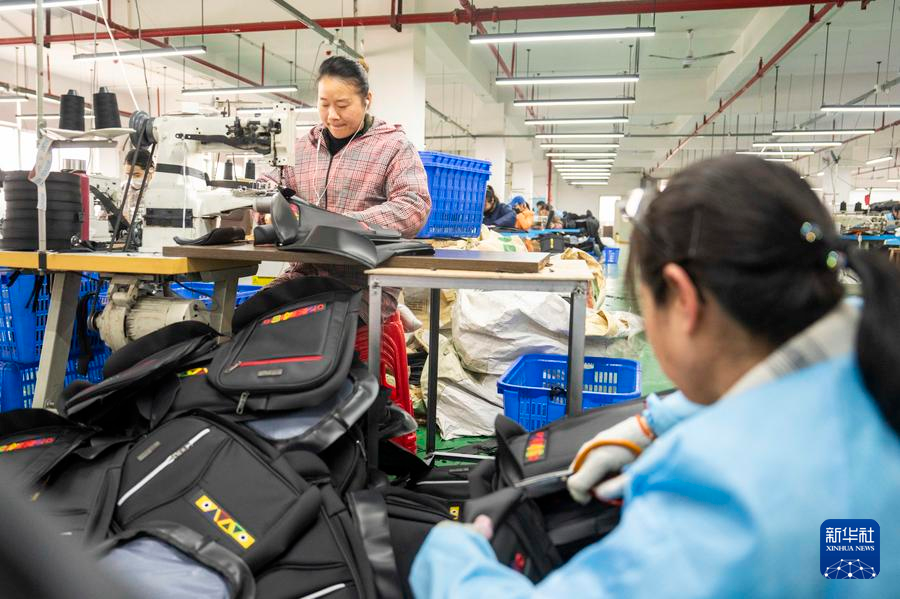 アフリカに輸出するリュックを作る従業員。(3月12日撮影、長沙=新華社記者/陳思汗)