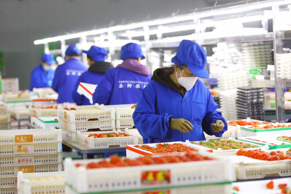 遼寧省丹東市の聖野漿果専門合作社(協同組合)で、収穫されたイチゴを箱詰めする従業員。(資料写真、丹東=新華社記者/陳為)